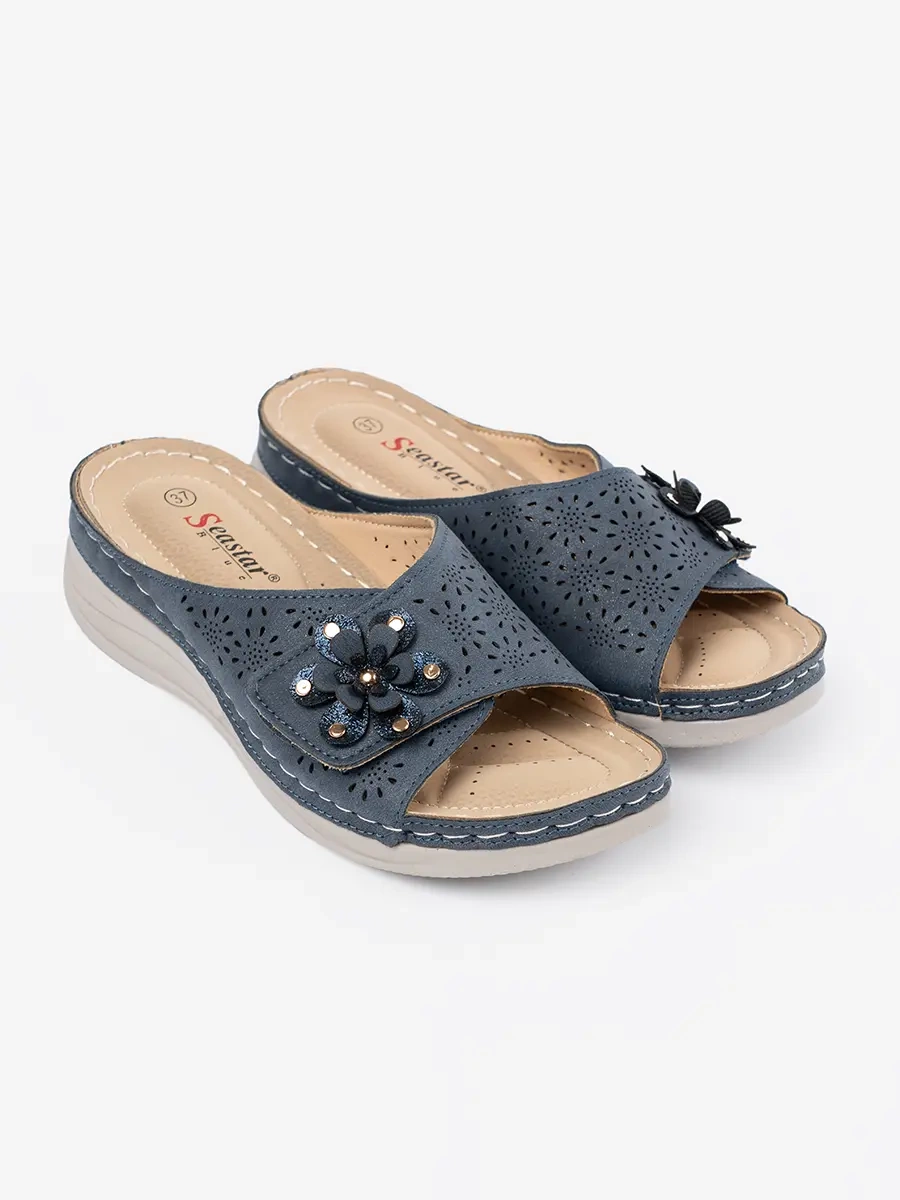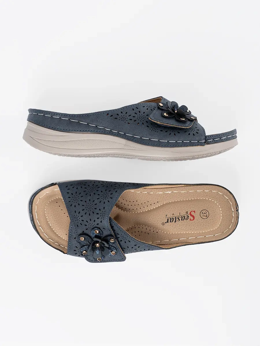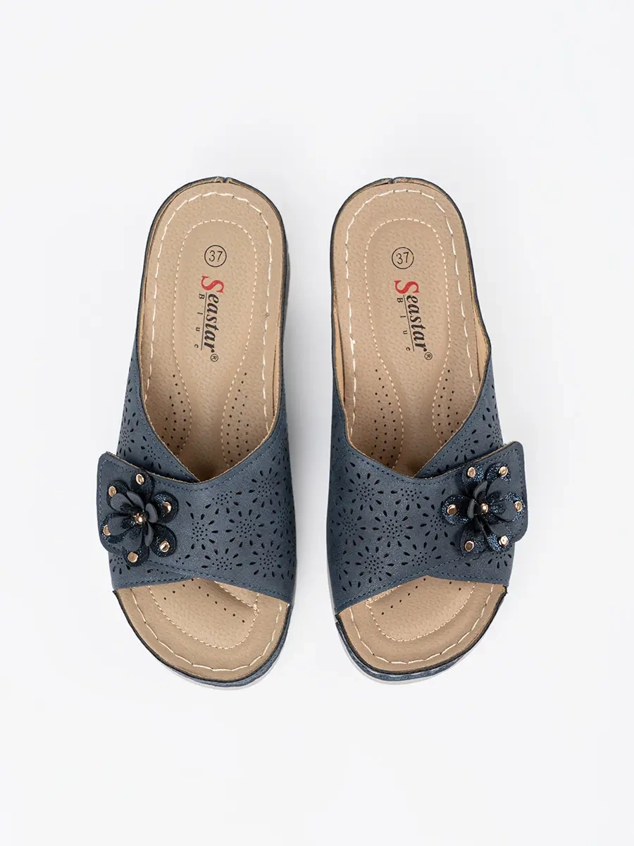 Navy blue women's flip-flops with decorative flower