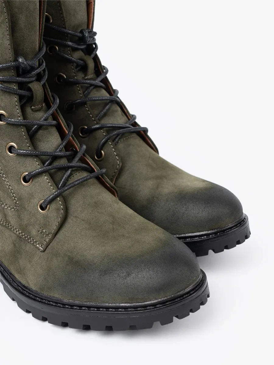 Dark green lace-up worker boots with low heel