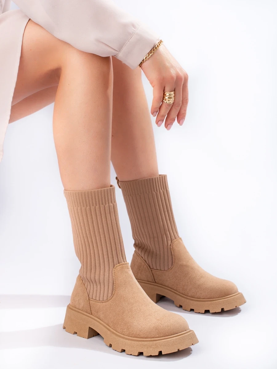 Zamszowe botki damskie z elastyczną cholewką beżowe