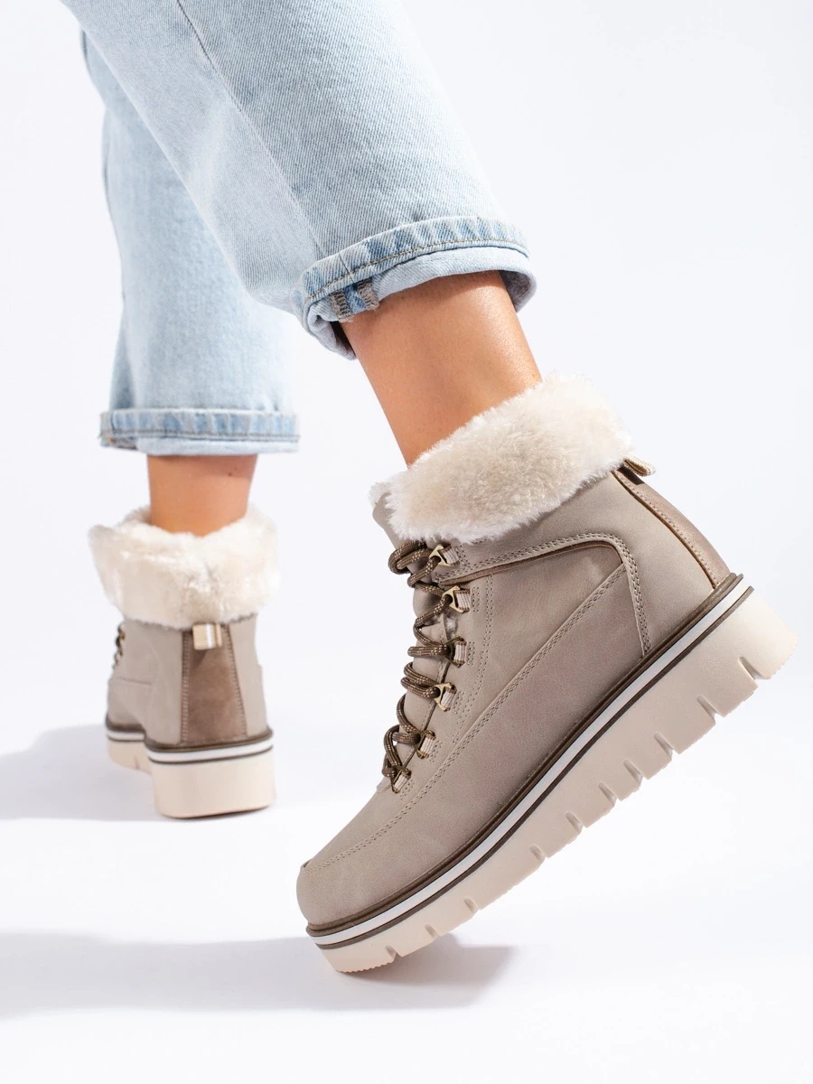 Odkryj wyjątkowy komfort i elegancję z naszymi beżowymi traperkami damskimi na platformie. Te niezwykłe buty łączą w sobie nowoczesny design z praktycznością, oferując Ci obuwie, które zapewni Ci wygodę i styl na co dzień.