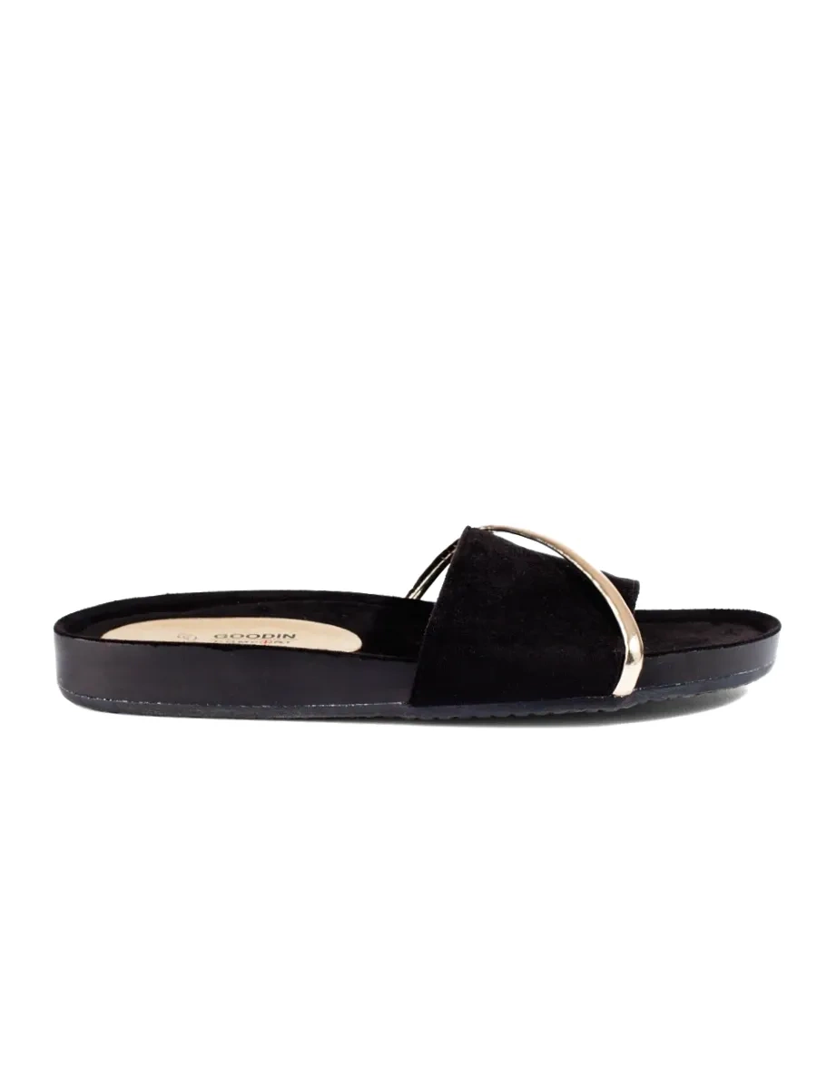 Odkryj wyjątkowe połączenie elegancji i wygody z naszymi czarnymi klapkami ze złotą ozdobą. Te damskie buty łączą w sobie klasyczny styl z nowoczesnym akcentem, oferując Ci obuwie, które podkreśli Twój styl i doda pewności siebie każdej stylizacji.