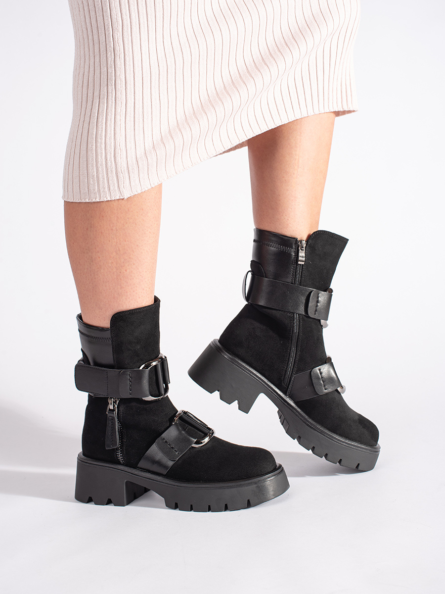 Czarne zamszowe botki damskie z klamrami