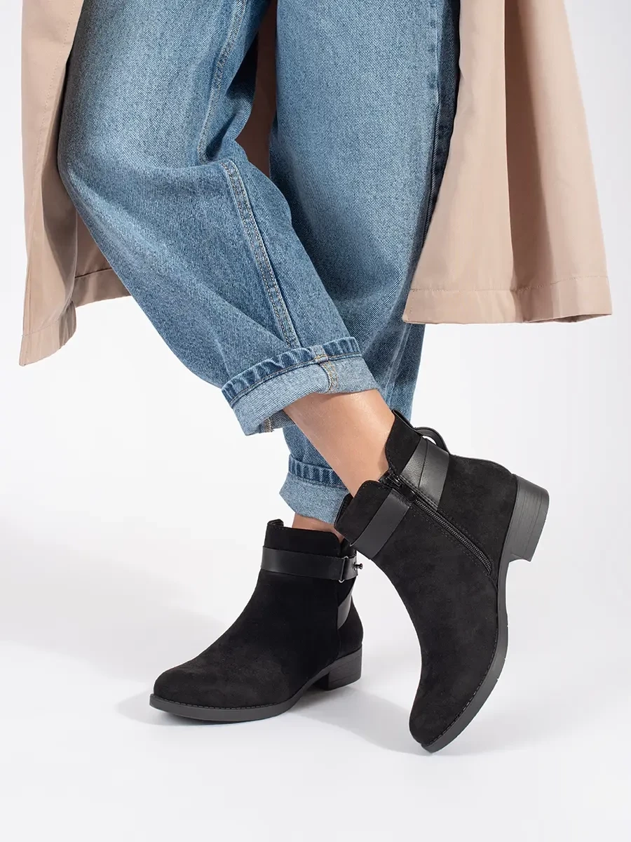 Czarne zamszowe botki damskie z ozdobnym paskiem