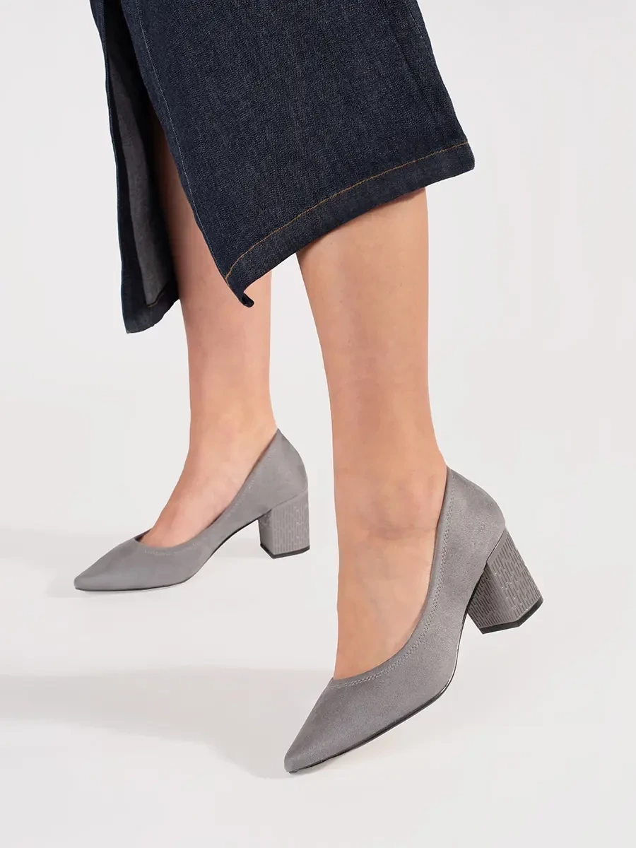 Szare zamszowe czółenka z noskiem w szpic – elegancja na co dzień