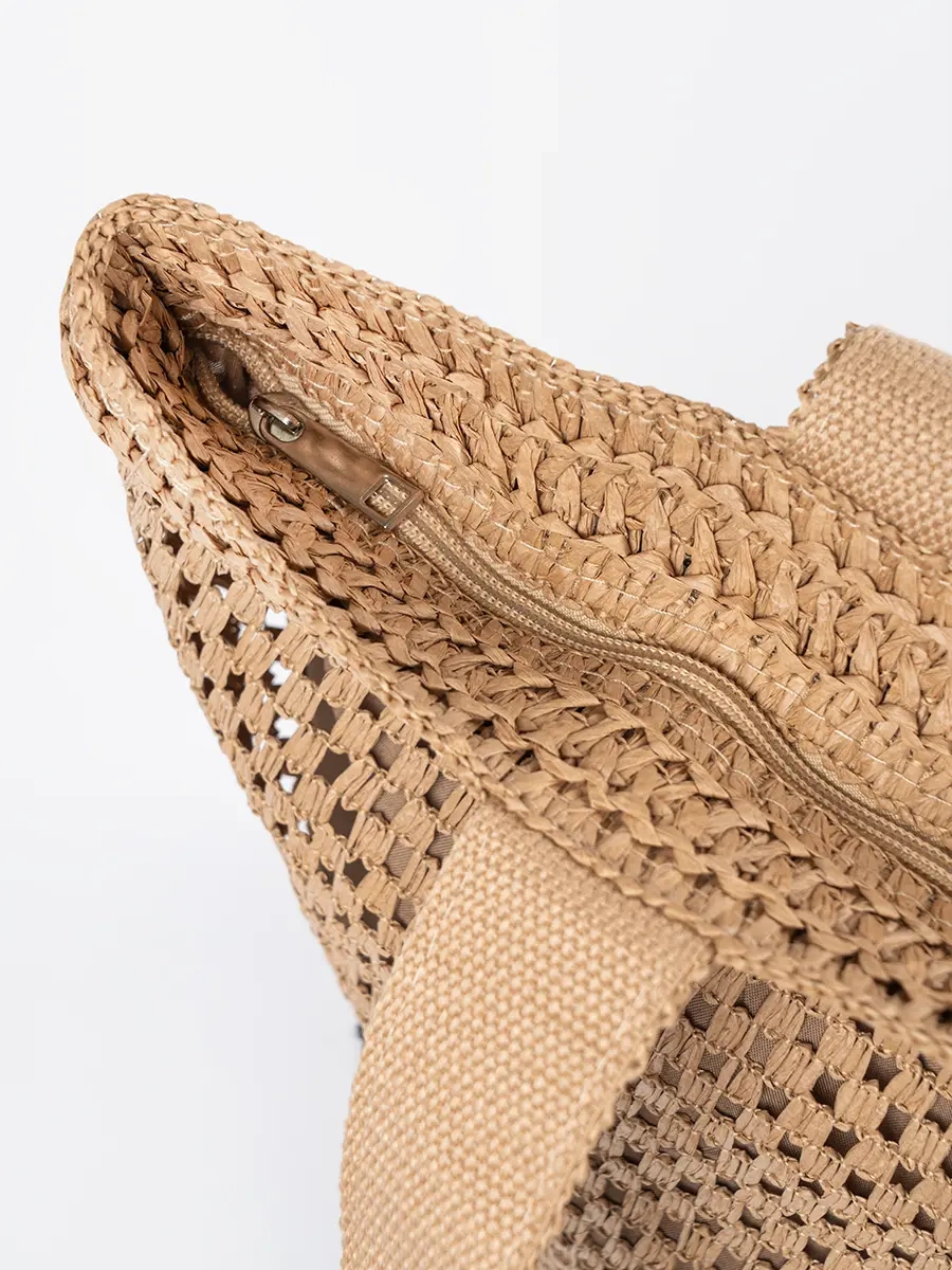 Beżowa torba plażowa została zaprojektowana z myślą o nowoczesnej kobiecie, ceniącej sobie styl i praktyczność. Jej przestronne wnętrze, zamykane na zamek, pomieści wszystkie niezbędne rzeczy, a dodatkowa kieszeń wewnętrzna pozwoli na bezpieczne przechowywanie drobniejszych przedmiotów.