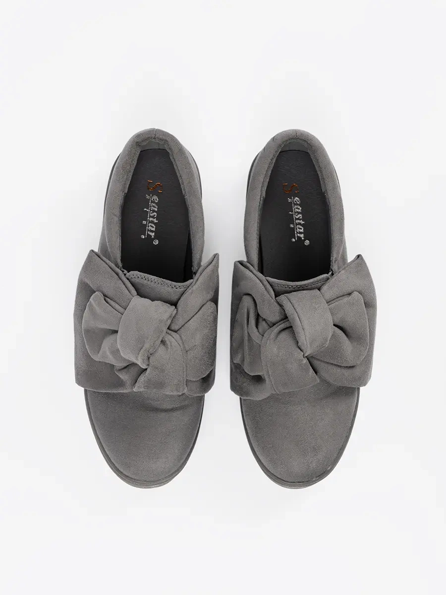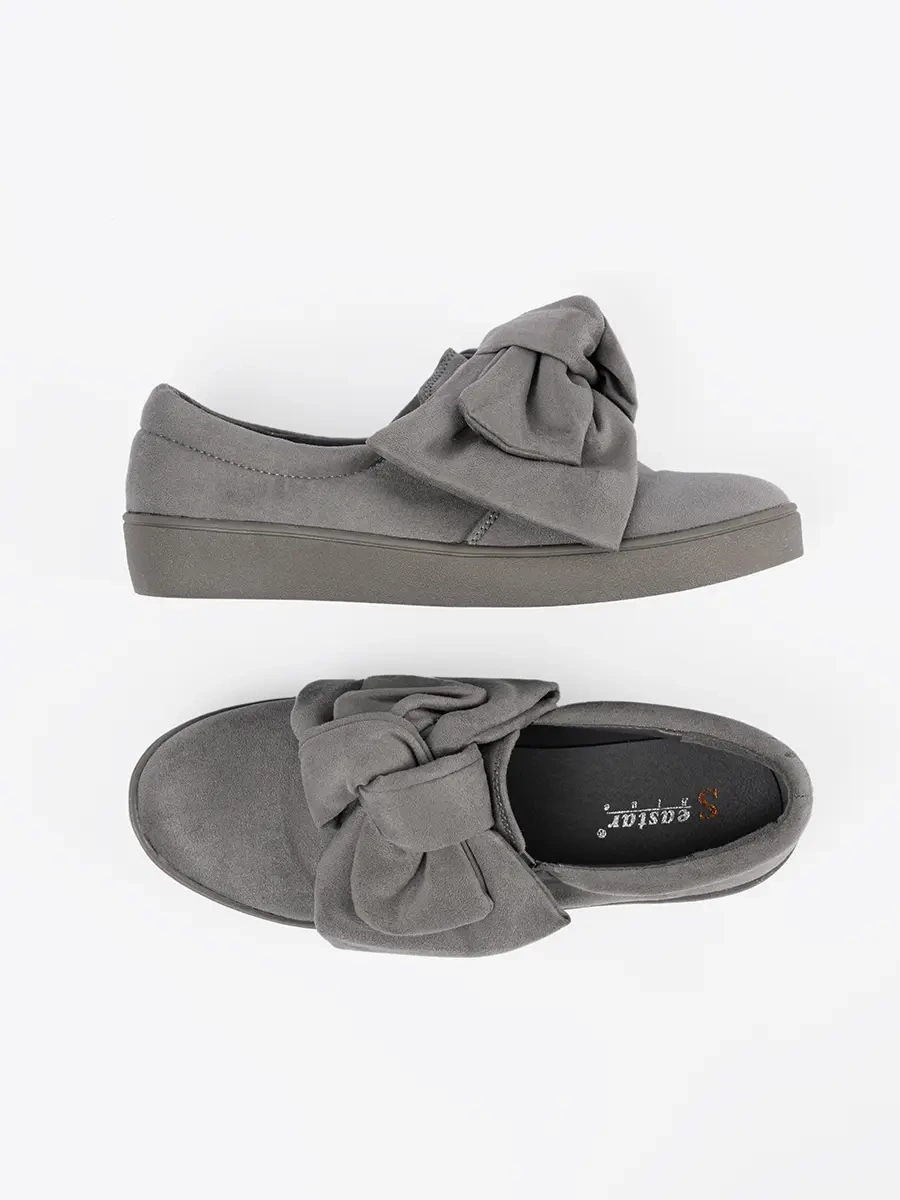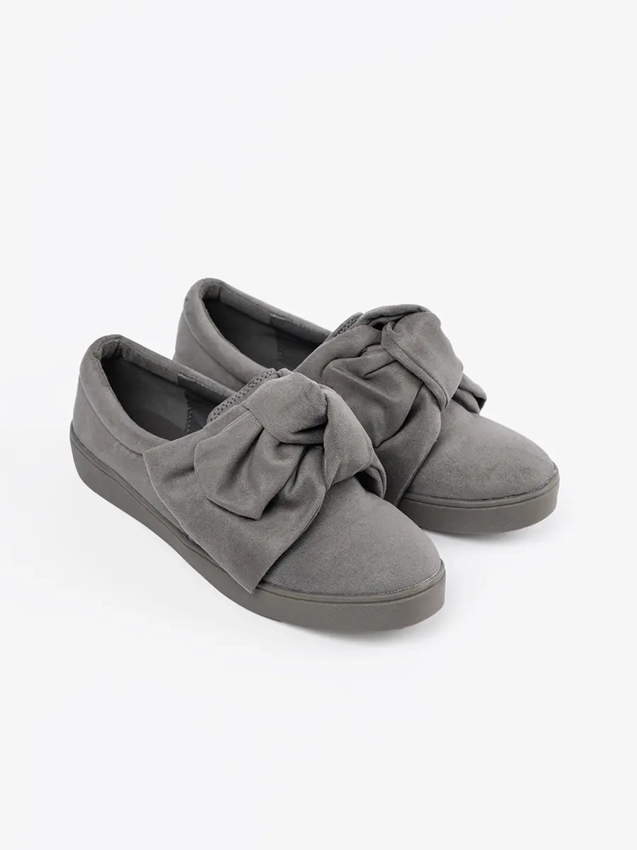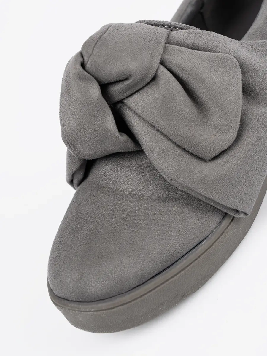 Szare wsuwane trampki z kokardą – elegancja spotyka wygodę