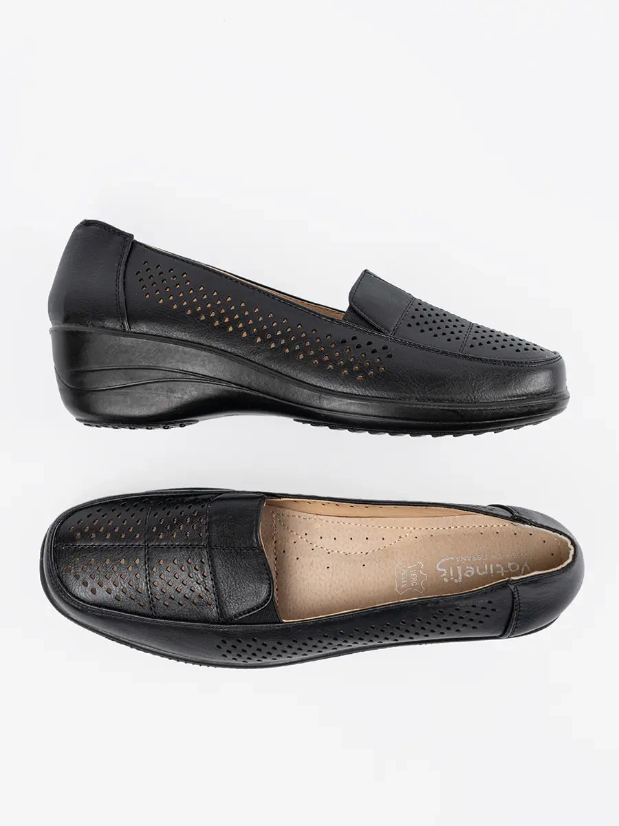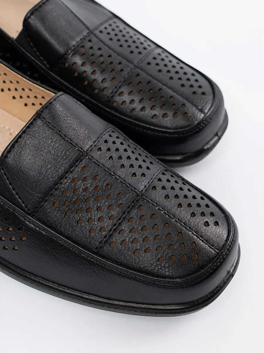 Czarne ażurowe półbuty damskie łączą w sobie elegancki design i wygodę użytkowania. Dzięki platformie, noszenie ich jest niezwykle komfortowe, a wsuwany rodzaj zapięcia umożliwia łatwe zakładanie i zdejmowanie. Ażurowy wzór dodaje butom lekkości i świeżości, idealnej na wiosnę i lato.