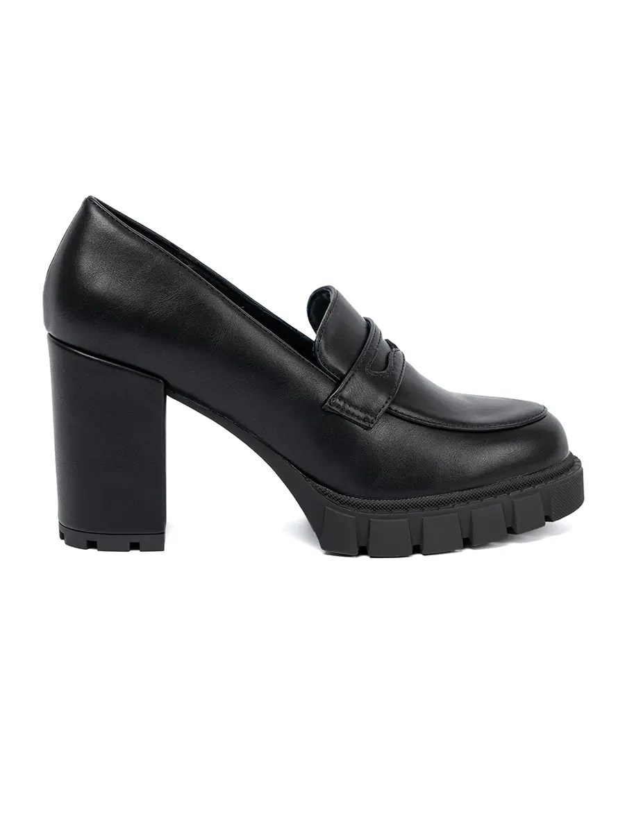 Czarne loafersy na słupku z traperową podeszwą - elegancja spotyka wygodę