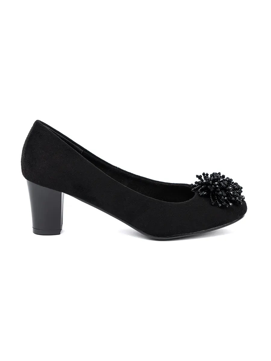 Czarne czółenka z ozdobną broszką – elegancja w każdym calu