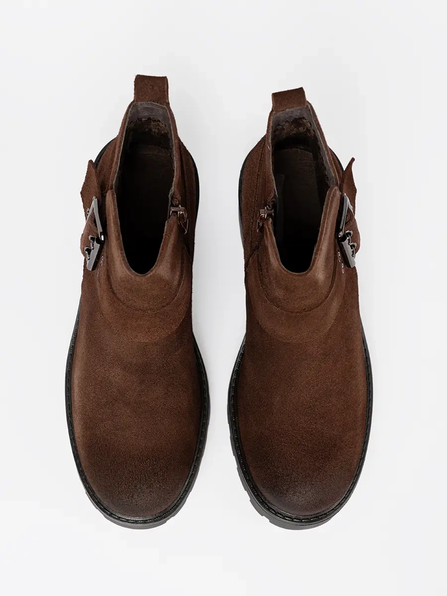 Botki są ocieplane, co czyni je idealnym wyborem na chłodniejsze dni. Gładka podeszwa z tworzywa sztucznego zapewnia dobrą przyczepność, a wysokość cholewki chroni stopę przed zimnem. Skóra naturalna nubuk dodaje butom luksusowego wyglądu i podkreśla ich wysoką jakość.
