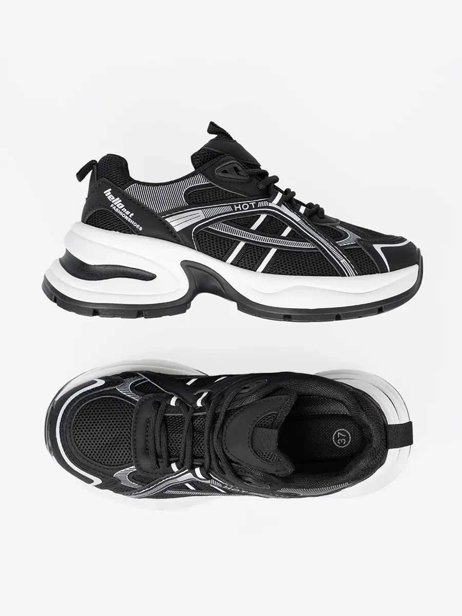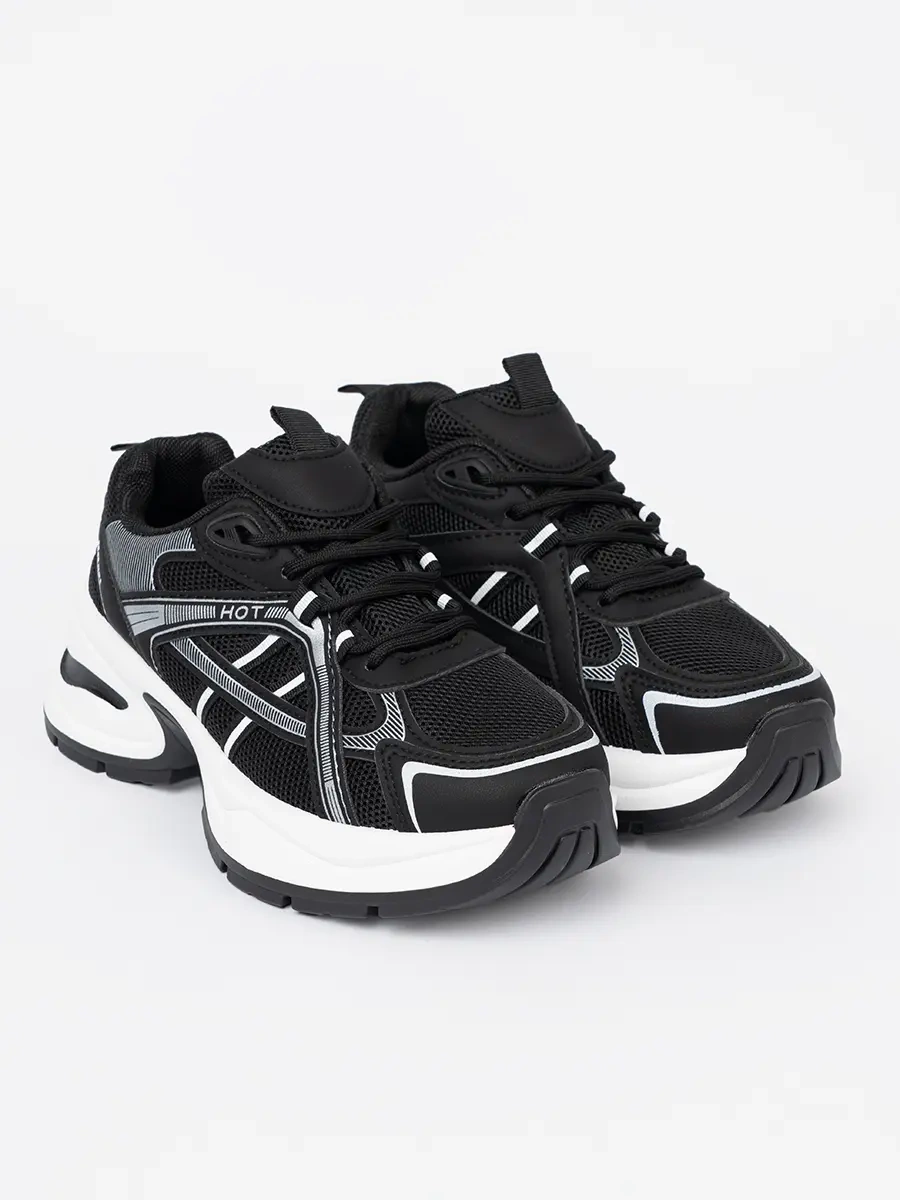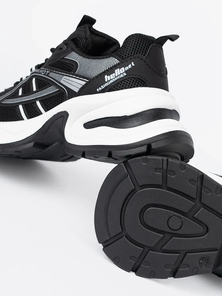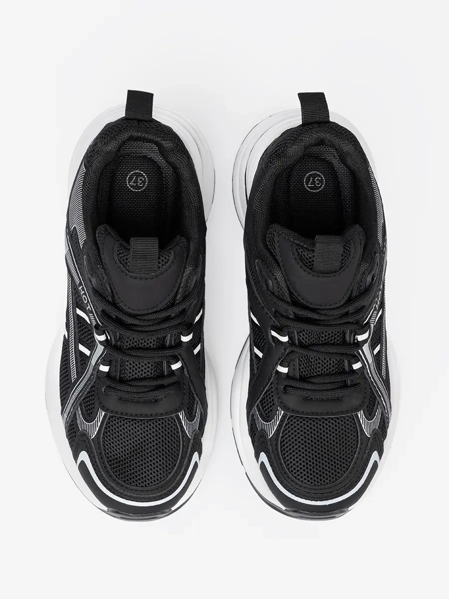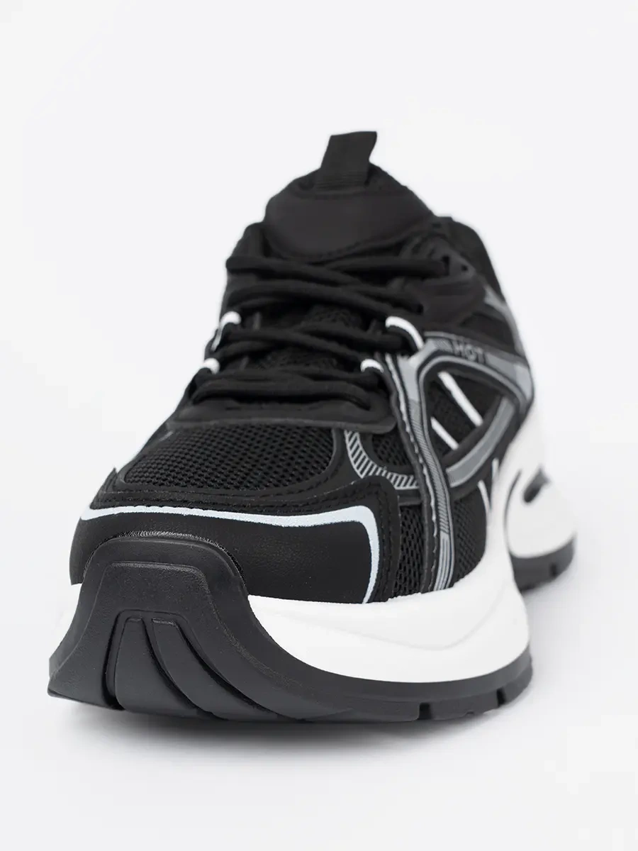 Czarne sneakersy z przewiewną cholewką i masywną białą podeszwą