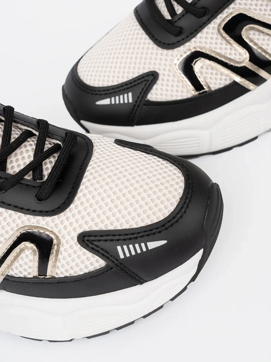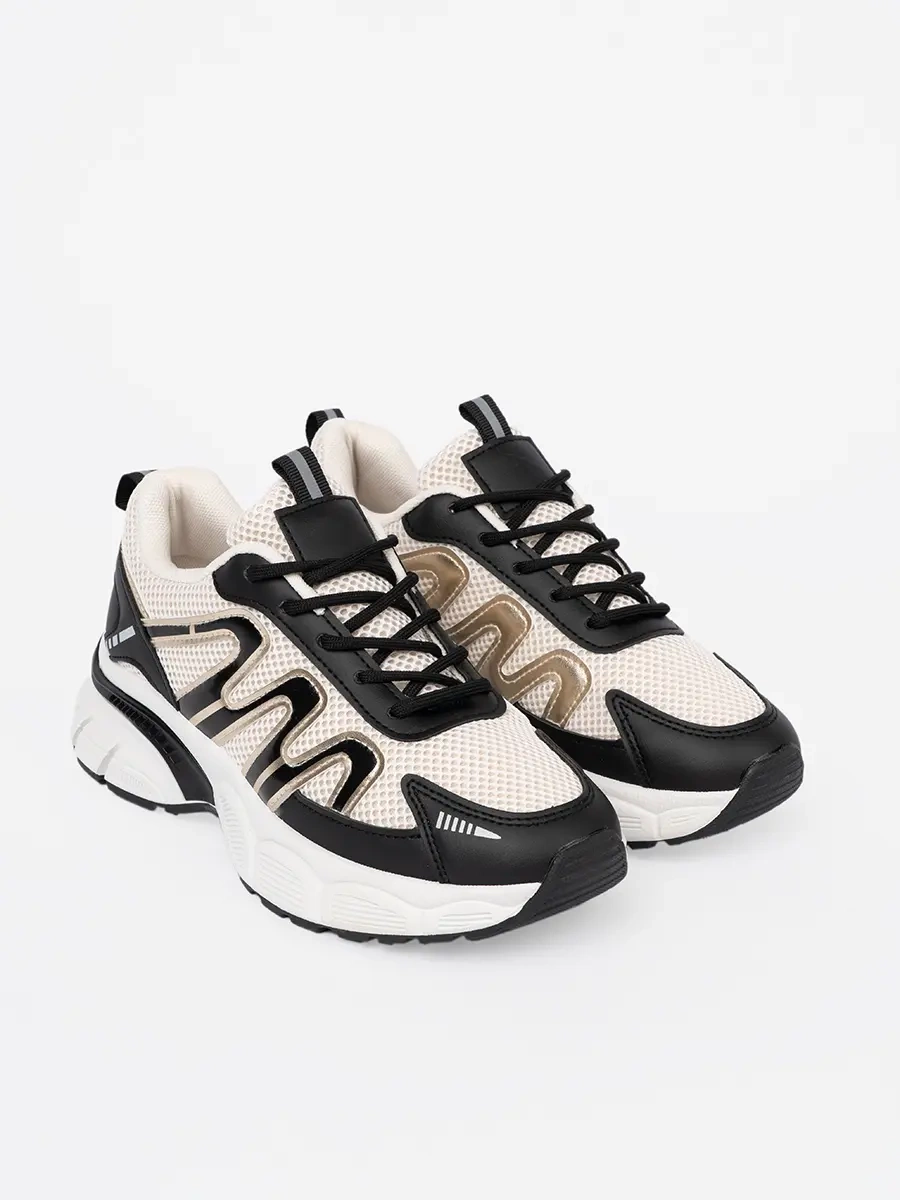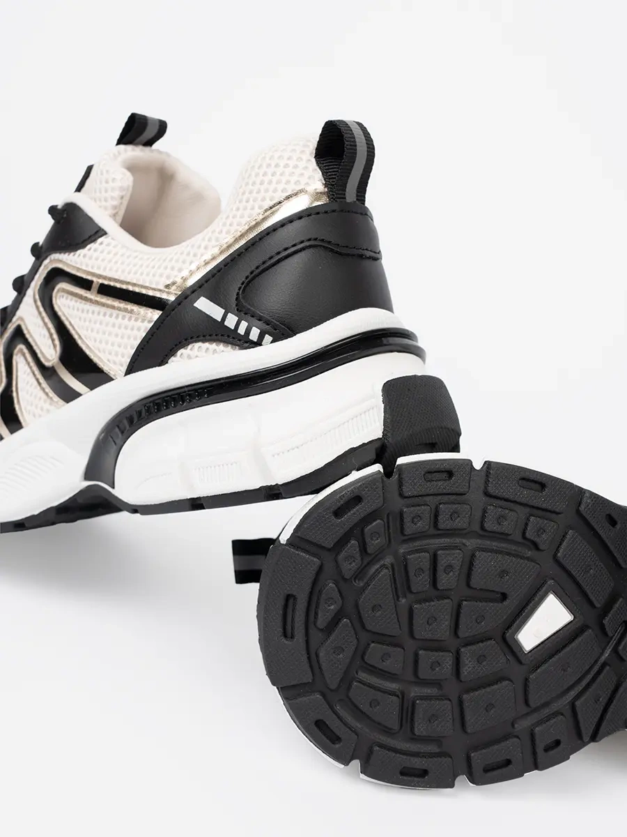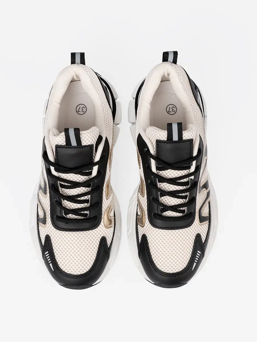 Beżowe buty z czarnymi akcentami i grubą podeszwą