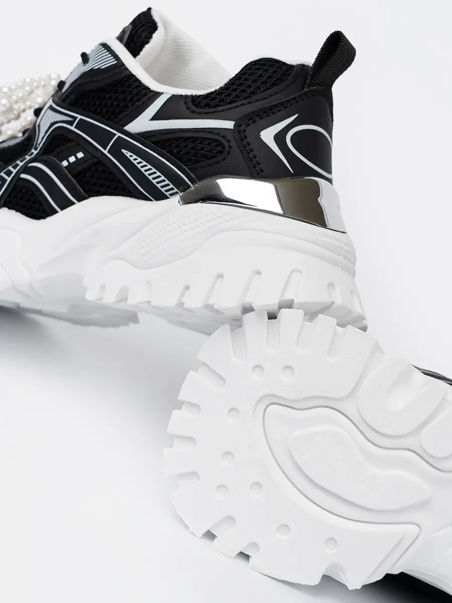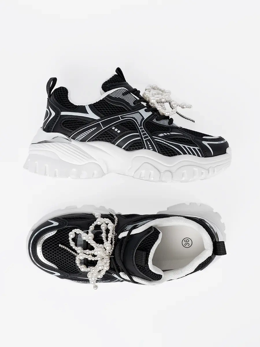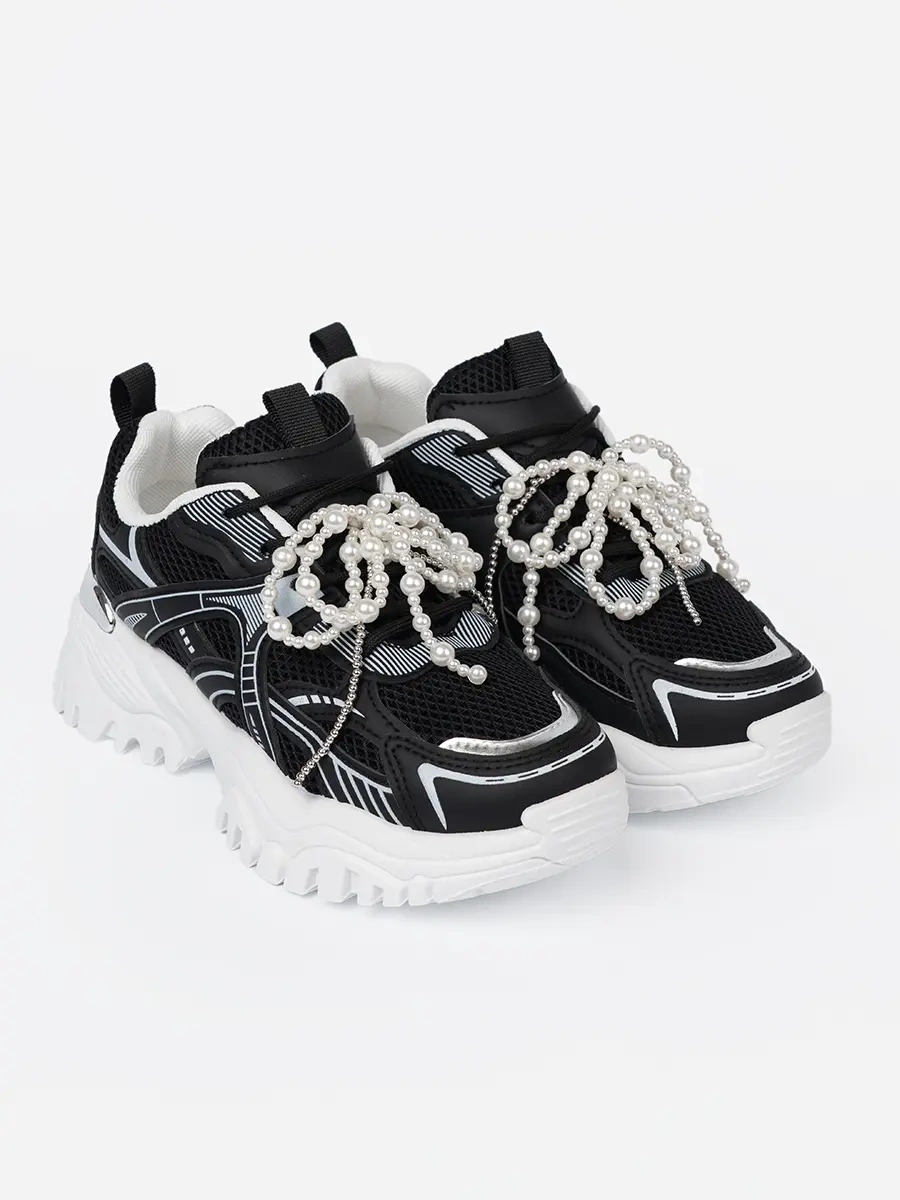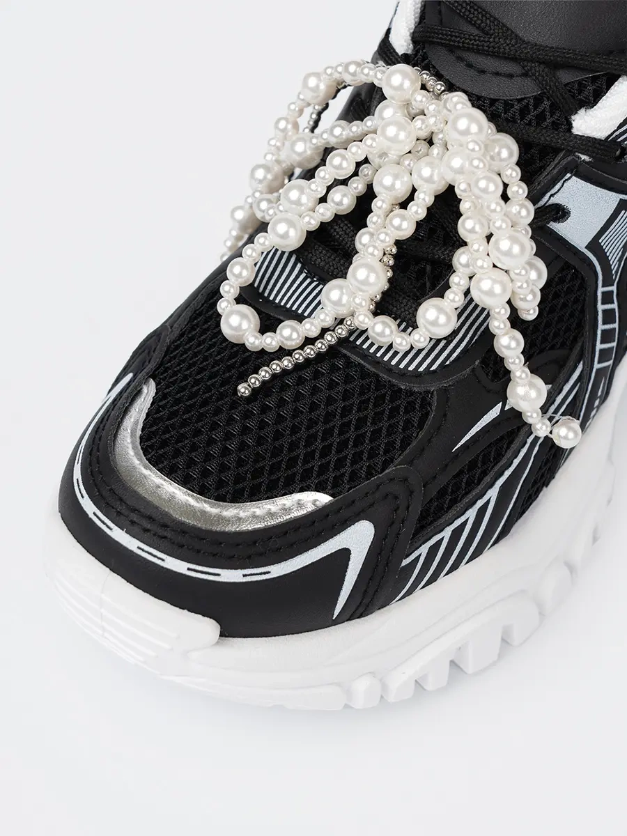 Czarne sneakersy z białą kokardą i koralikami - elegancja spotyka wygodę