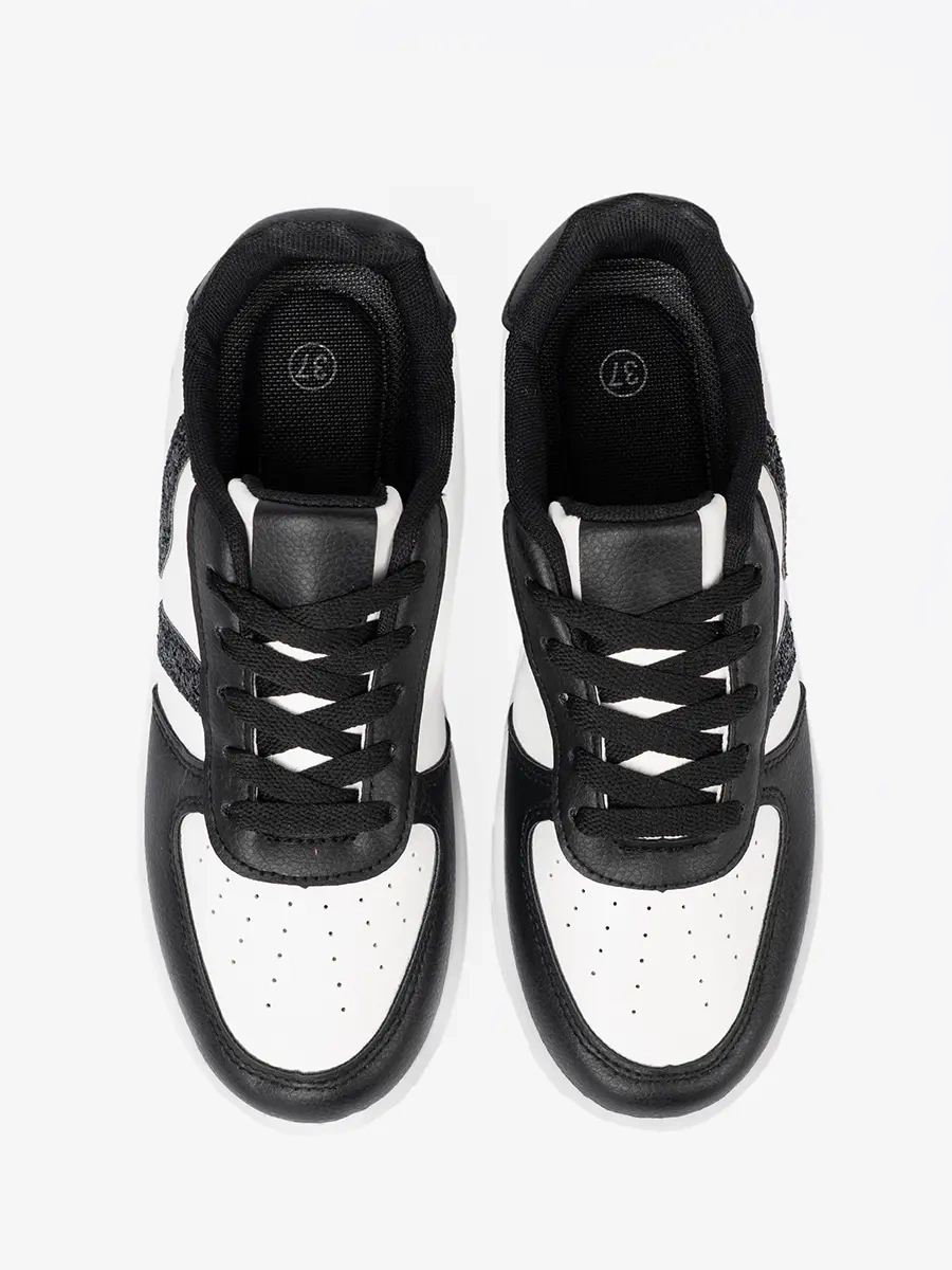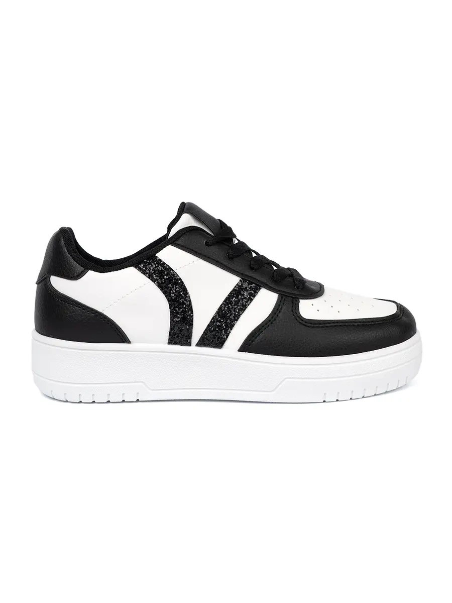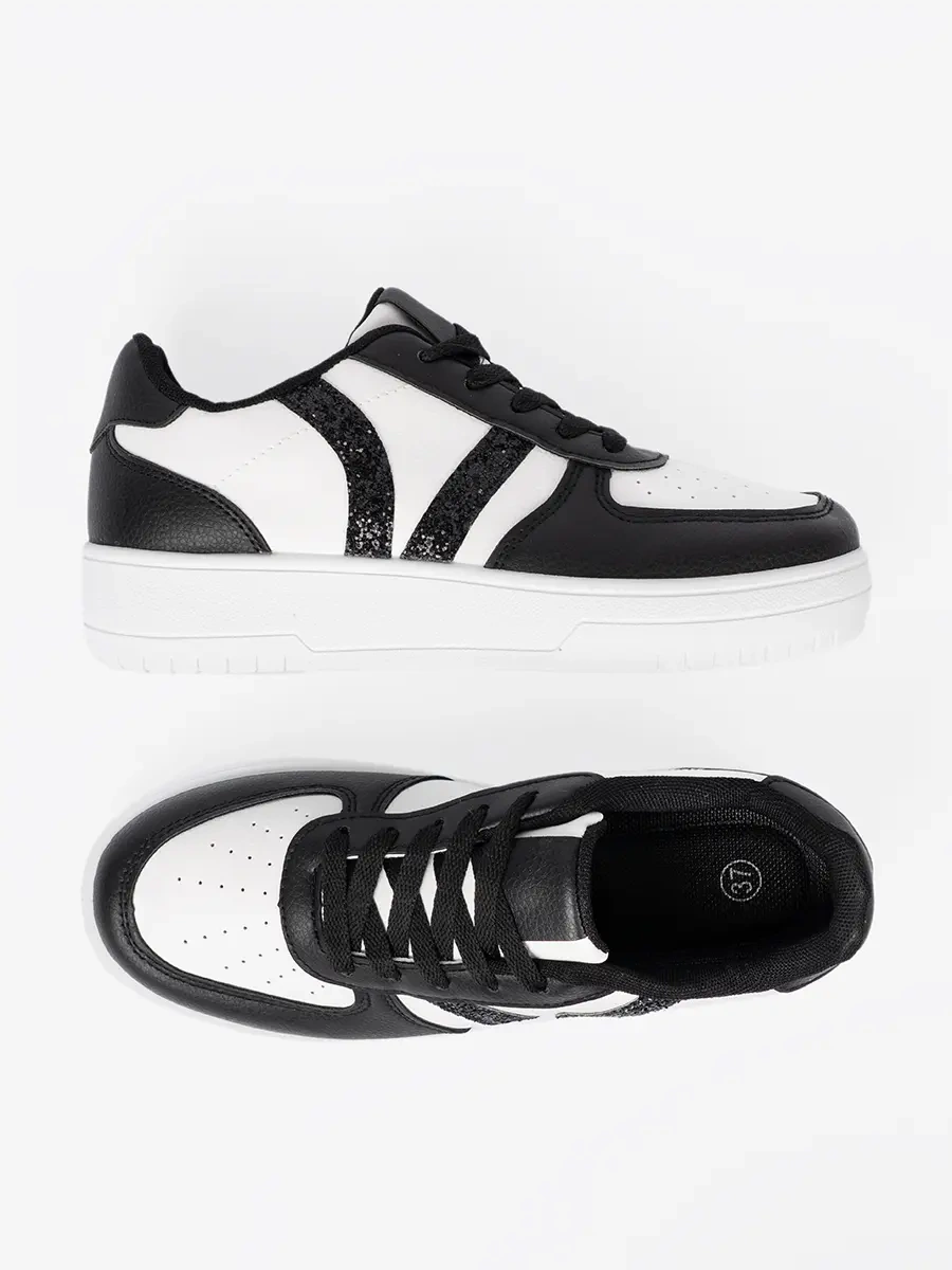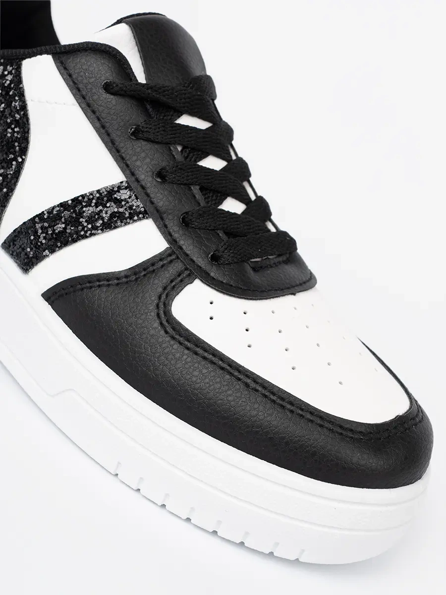 Podkreśl swoją indywidualność i zaskocz otoczenie naszymi nowymi, stylowymi sneakersami w kolorach czarnym i białym, ozdobionymi błyszczącymi brokatowymi wstawkami. Te buty to kwintesencja miejskiego stylu i wygody, doskonałe na co dzień, zarówno do jeansów, jak i sportowej sukienki.