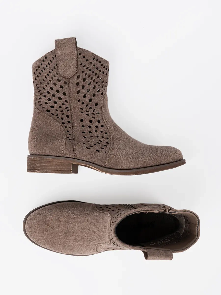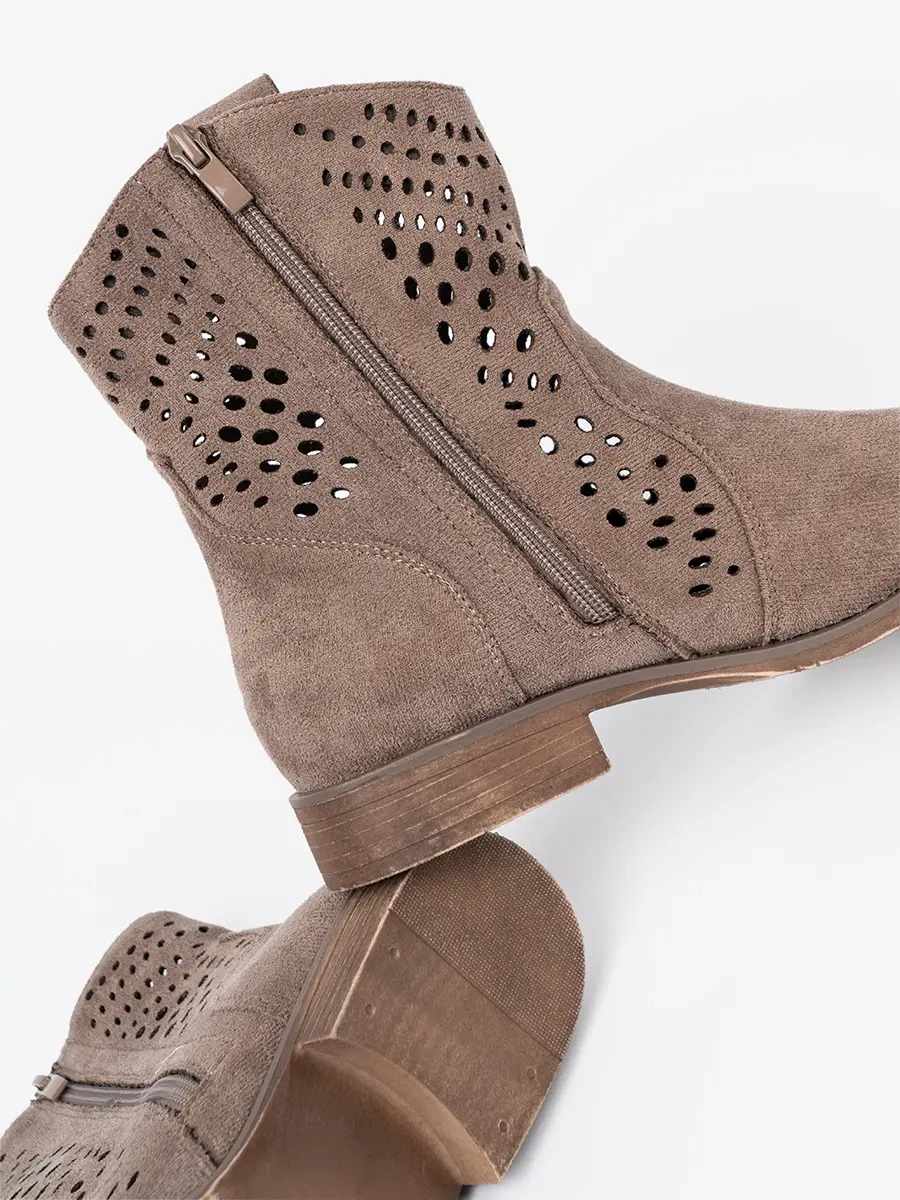 Botki, które prezentujemy, są wyrazem doskonałego połączenia stylu kowbojskiego z ażurowym wzorem. Dzięki temu obuwie wygląda niezwykle oryginalnie i świeżo. Ciemnobeżowy kolor dodaje botkom elegancji i sprawia, że pasują do wielu stylizacji. Wykonane z ekologicznego zamszu, gwarantują komfort noszenia i trwałość na lata.