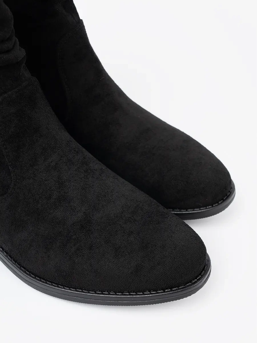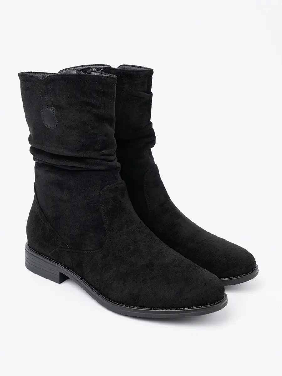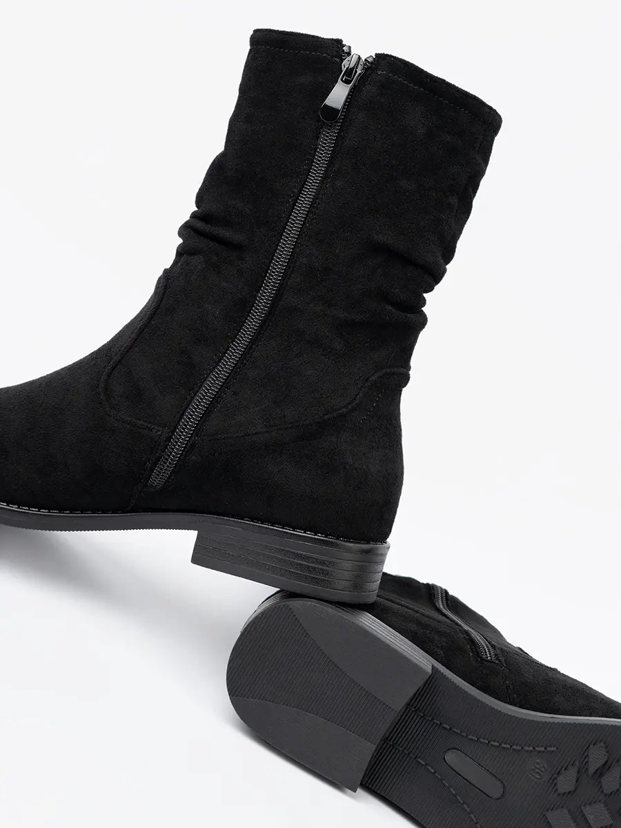 Botki charakteryzują się nowoczesnym designem, który zachwyca klasyczną elegancją. Marszczenia na cholewce dodają im niepowtarzalnego charakteru. Wykonane z imitacji zamszu, gwarantują trwałość i doskonały wygląd przez wiele sezonów. Ich czarny kolor sprawia, że łatwo dopasujesz je do różnych stylizacji.