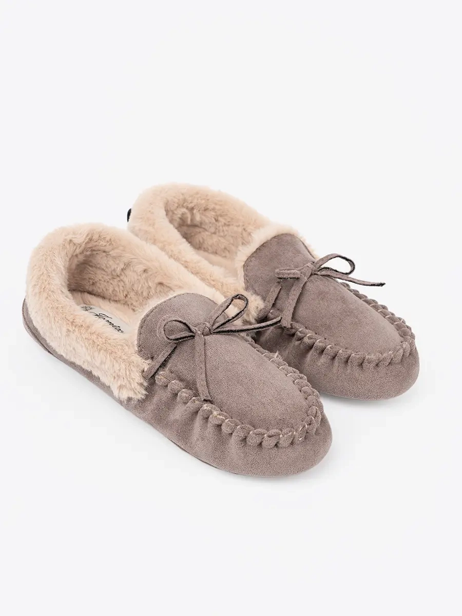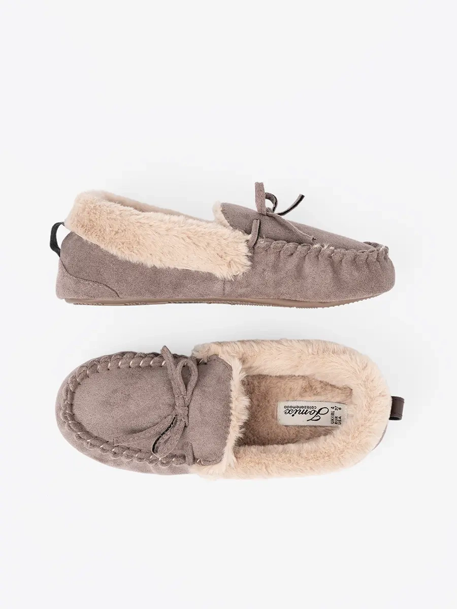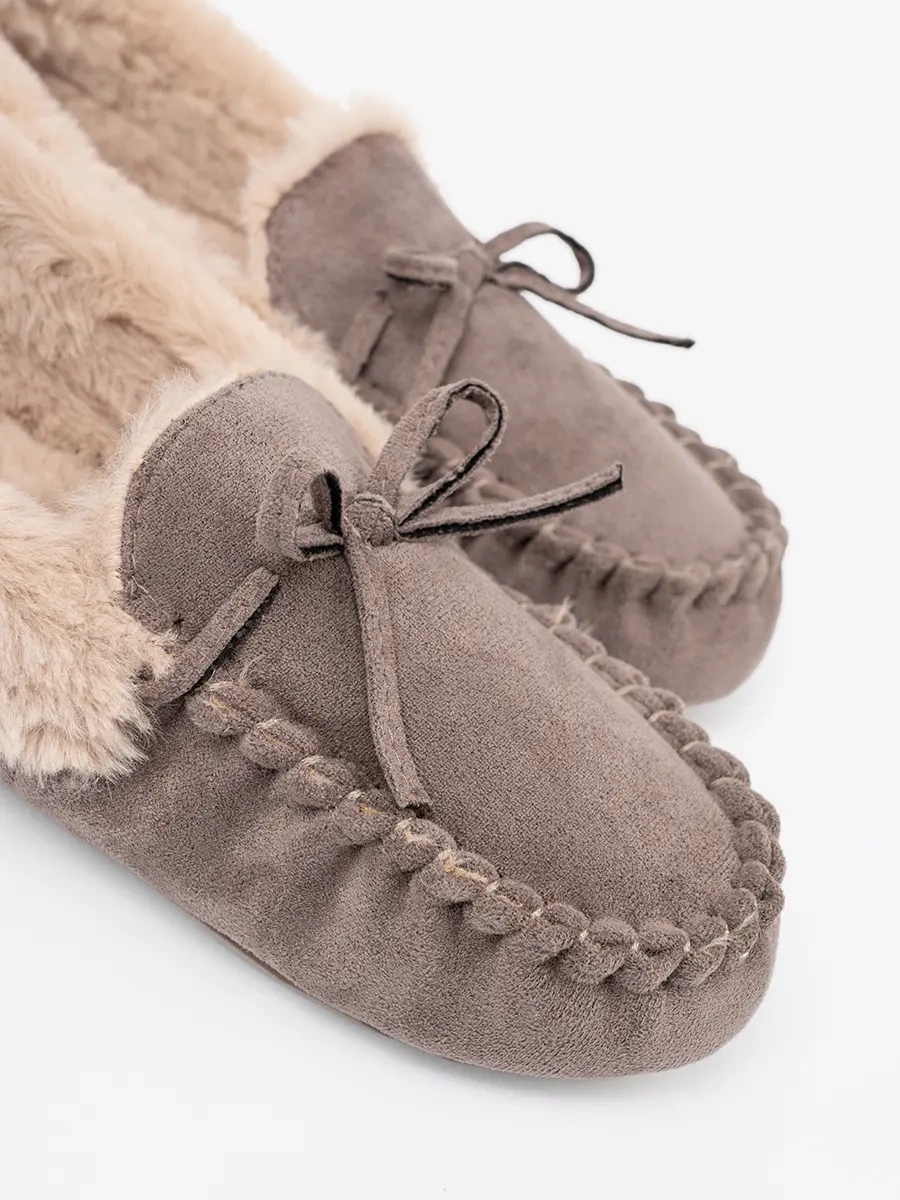 Ciemnobeżowe kapcie z kokardką i puszystym wnętrzem typu mokasyny