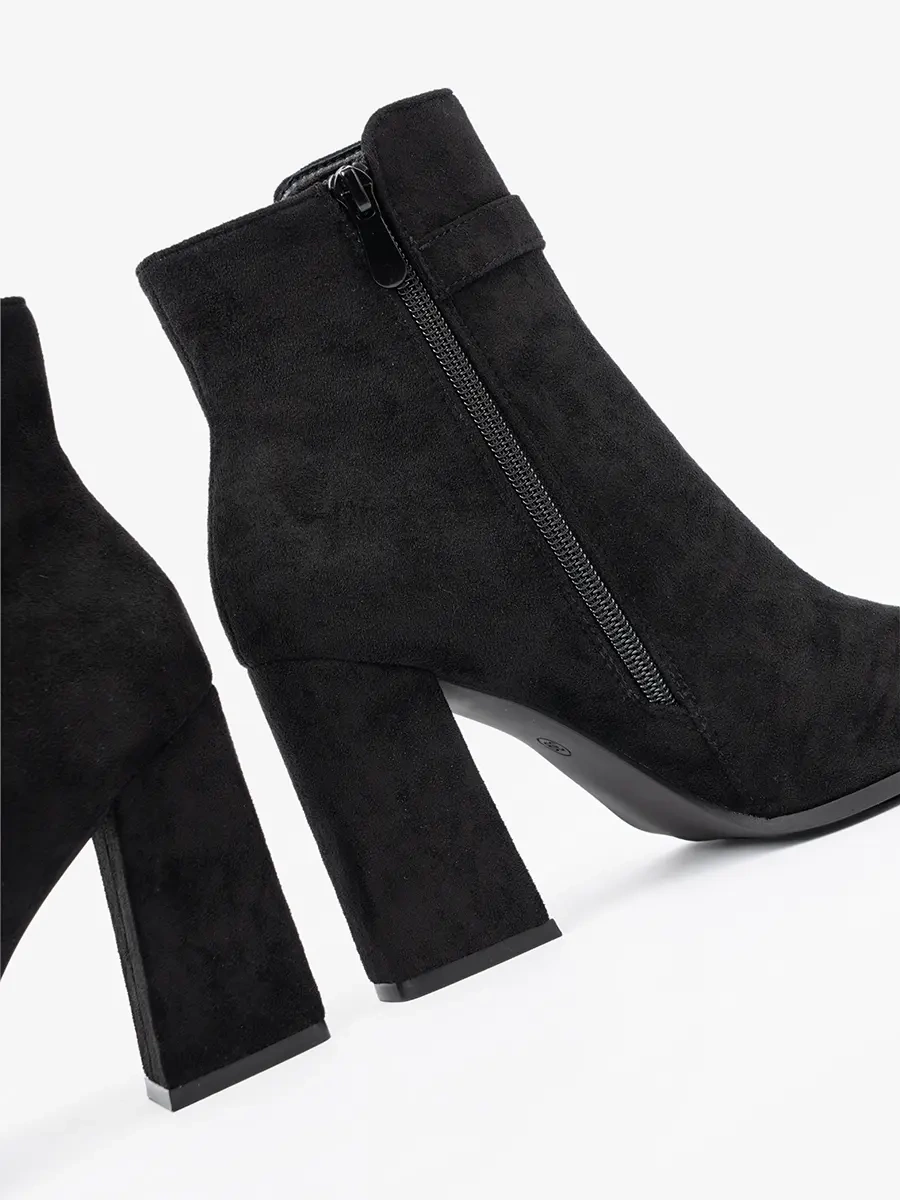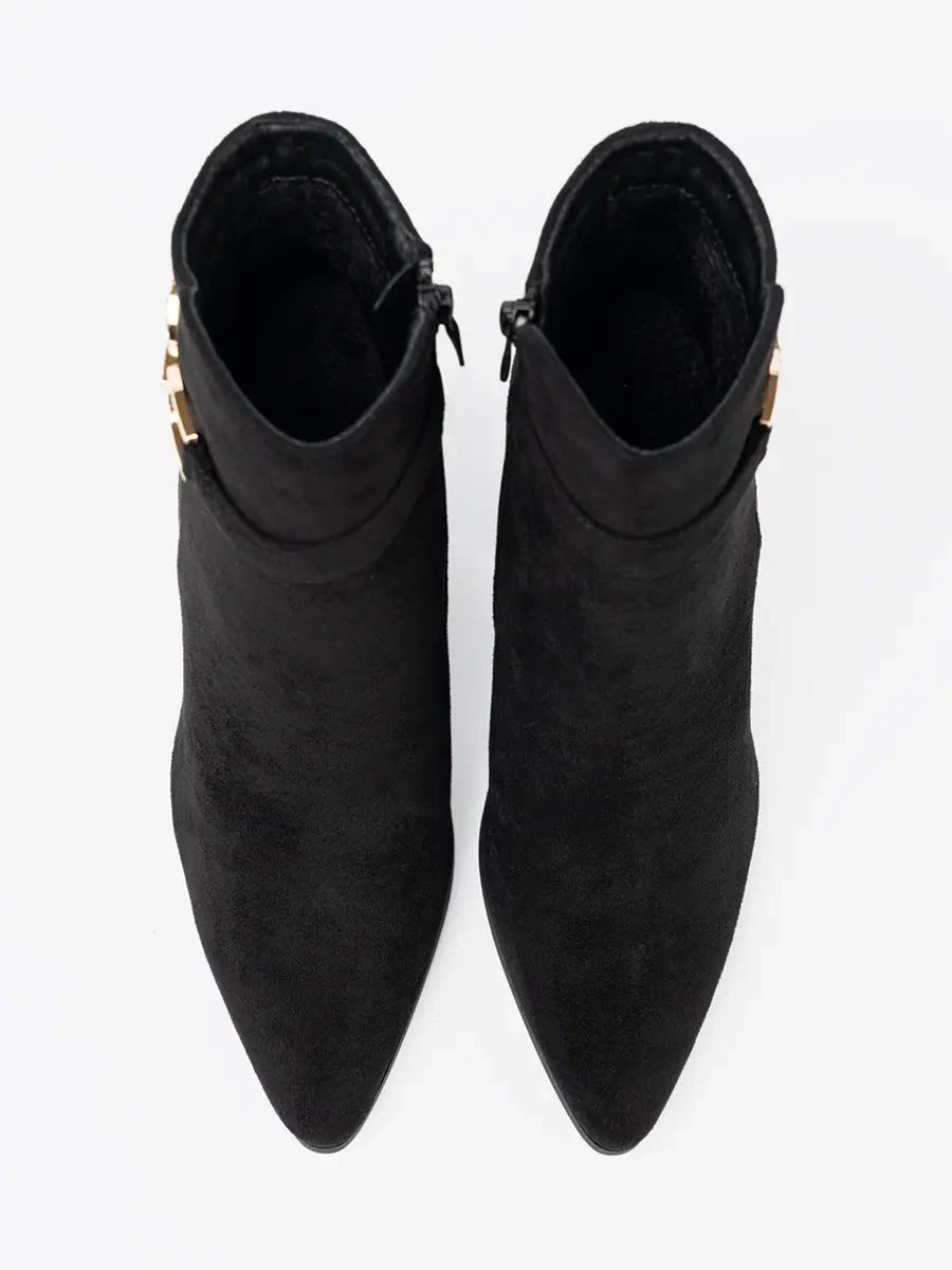 Nasze botki zostały stworzone z myślą o kobietach ceniących sobie luksus i wygodę. Wykonane z wysokiej jakości imitacji zamszu, zapewniają nie tylko elegancki wygląd, ale także trwałość na lata. Uniwersalny, głęboki odcień czerni dodaje charakteru i pasuje do każdego outfitu, zarówno eleganckiego, jak i codziennego.