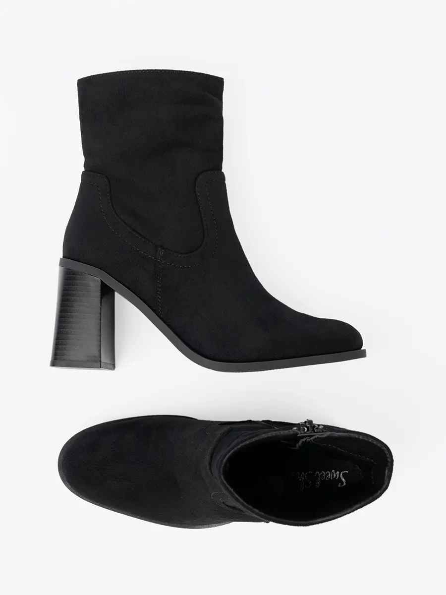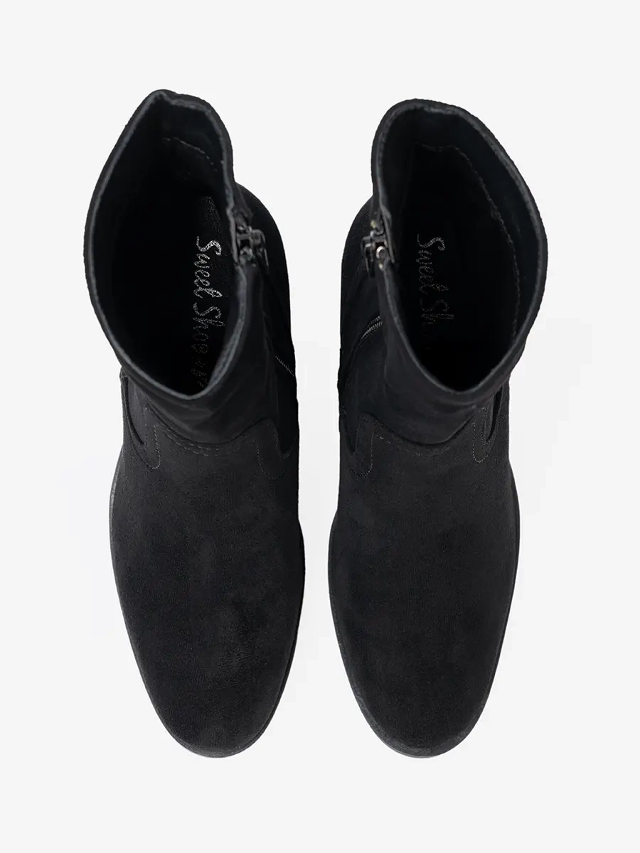 Te czarne botki na obcasie to połączenie elegancji i wygody. Wykonane z imitacji zamszu, są nie tylko estetyczne, ale również przyjemne w noszeniu. Zapiętek z tworzywa sztucznego gwarantuje stabilność, a wysokość obcasa jest idealnie dobrana, aby zapewnić komfort nawet podczas długotrwałego noszenia.