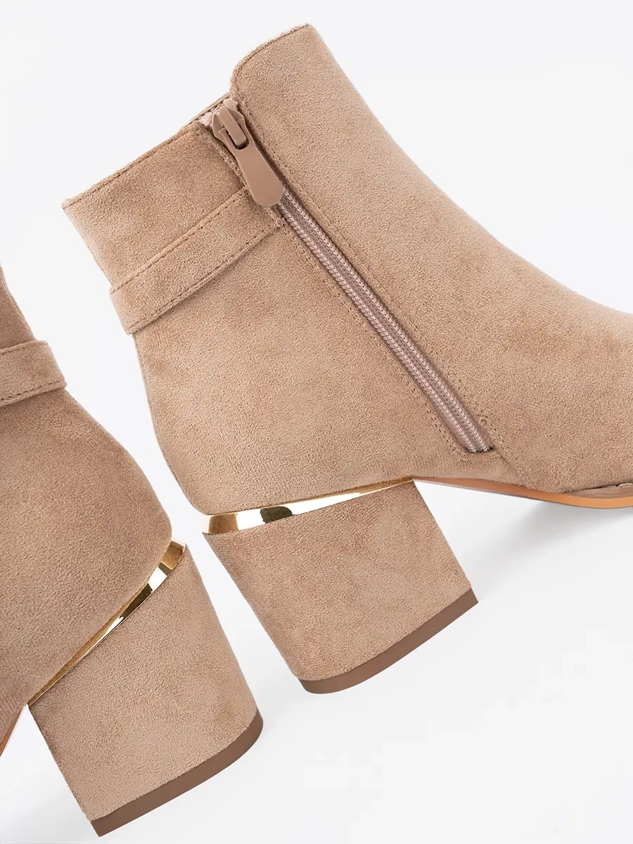 Wygodna wysokość obcasa typu słupek, zapewnia komfort podczas całodziennej aktywności. Praktyczne zapięcie na suwak ułatwia zakładanie i zdejmowanie butów. Wewnętrzna strona botków wykonana jest z miękkiego materiału tekstylnego, który zapewnia optymalny klimat dla stóp.