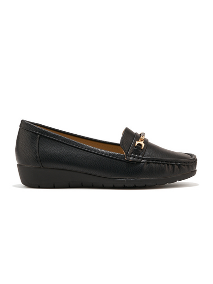 Czarne damskie mokasyny na koturnie ze złotym zdobieniem