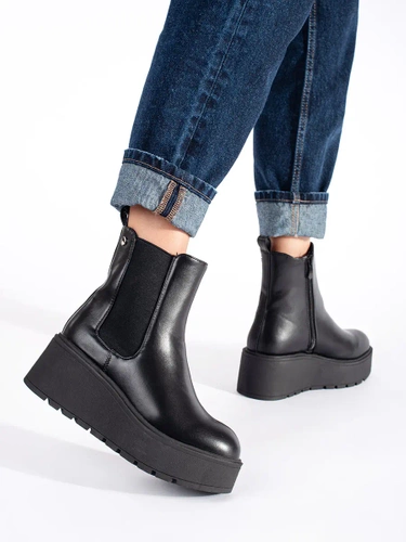 Czarne botki ze skóry naturalnej na grubej tłoczonej podeszwie