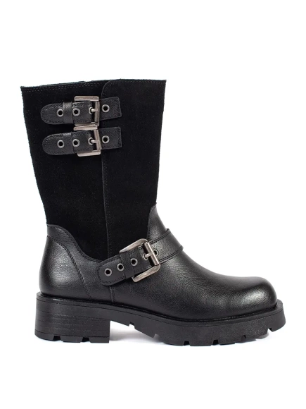 Czarne skórzane botki damskie na platformie ozdobione paskami Sergio Leone